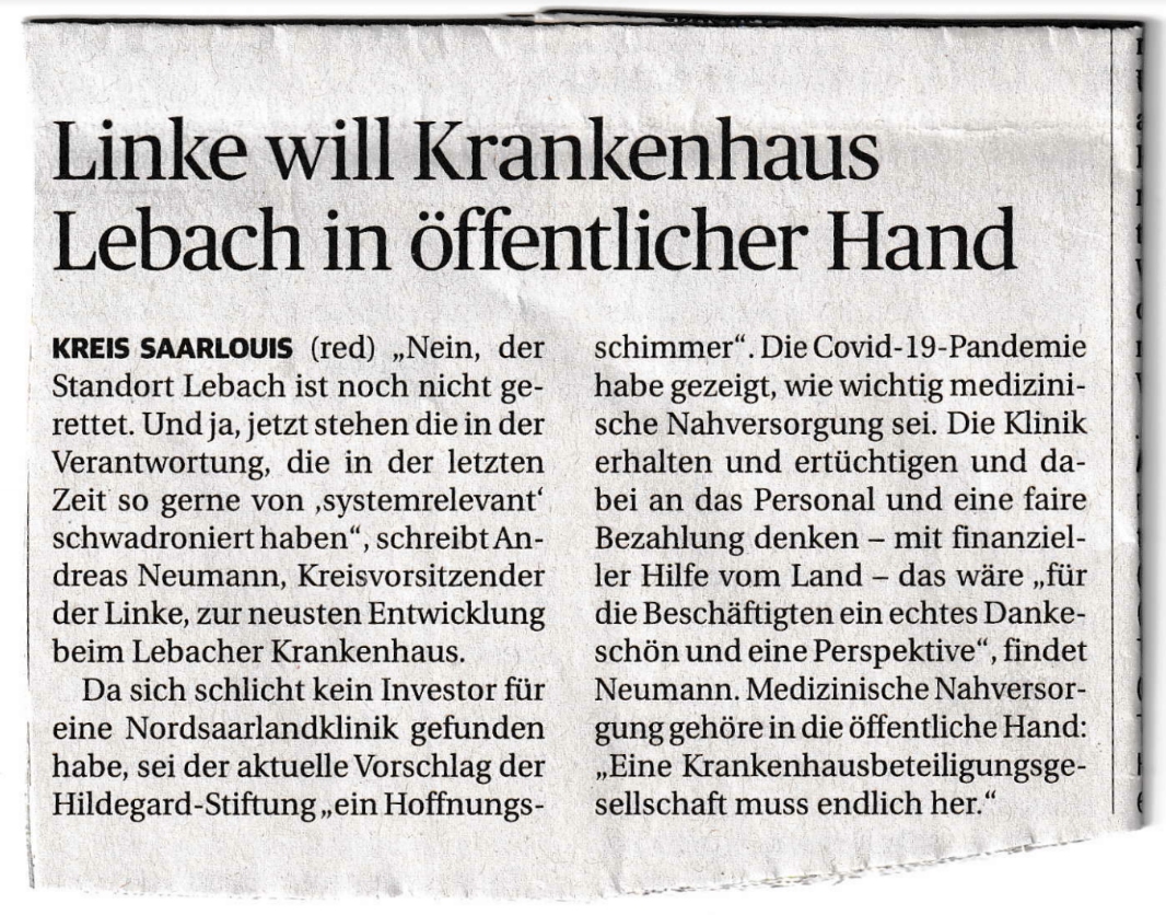 30. Mai 2020KVSLS: Linke will Krankenhaus Lebach in öffentliche Hand