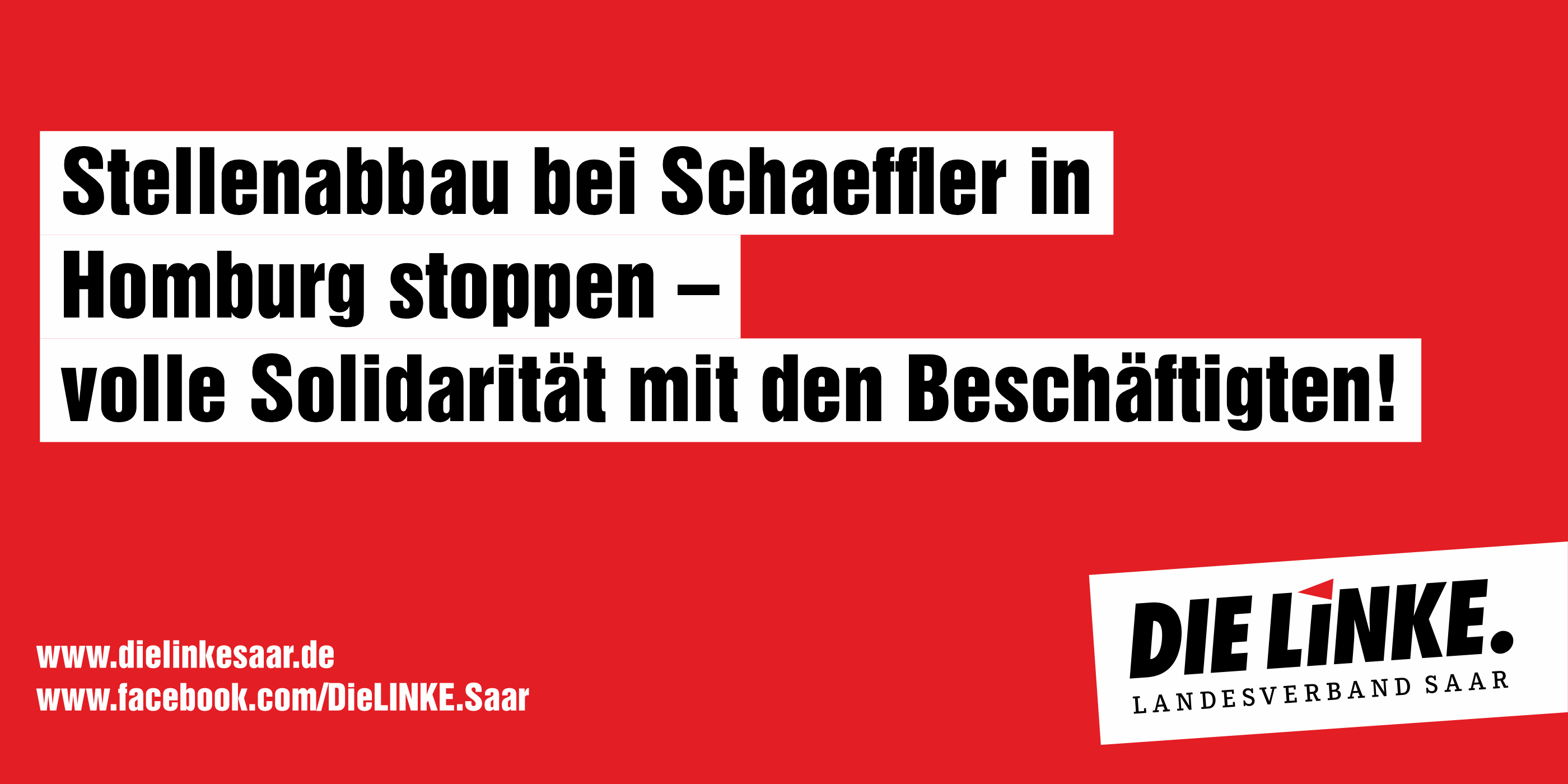 DIE LINKE.Saar steht hinter den Beschäftigten von Schaeffler in Homburg und fordert einen sofortigen Stopp des geplanten Stellenabbaus. Die Landesvorsitzende, die Homburgerin Barbara Spaniol, dazu: „Wir sind solidarisch mit den Beschäftigten. Die Sorgen und die Unsicherheit sind mit Blick auf die Zukunft der Industriearbeitsplätze am Wirtschaftsstandort Homburg schon lange groß. Seit Jahren geht hier schleichend eine Vielzahl von Arbeitsplätzen verloren. Hinter den Zahlen stehen aber Saarländerinn... » weiterlesen