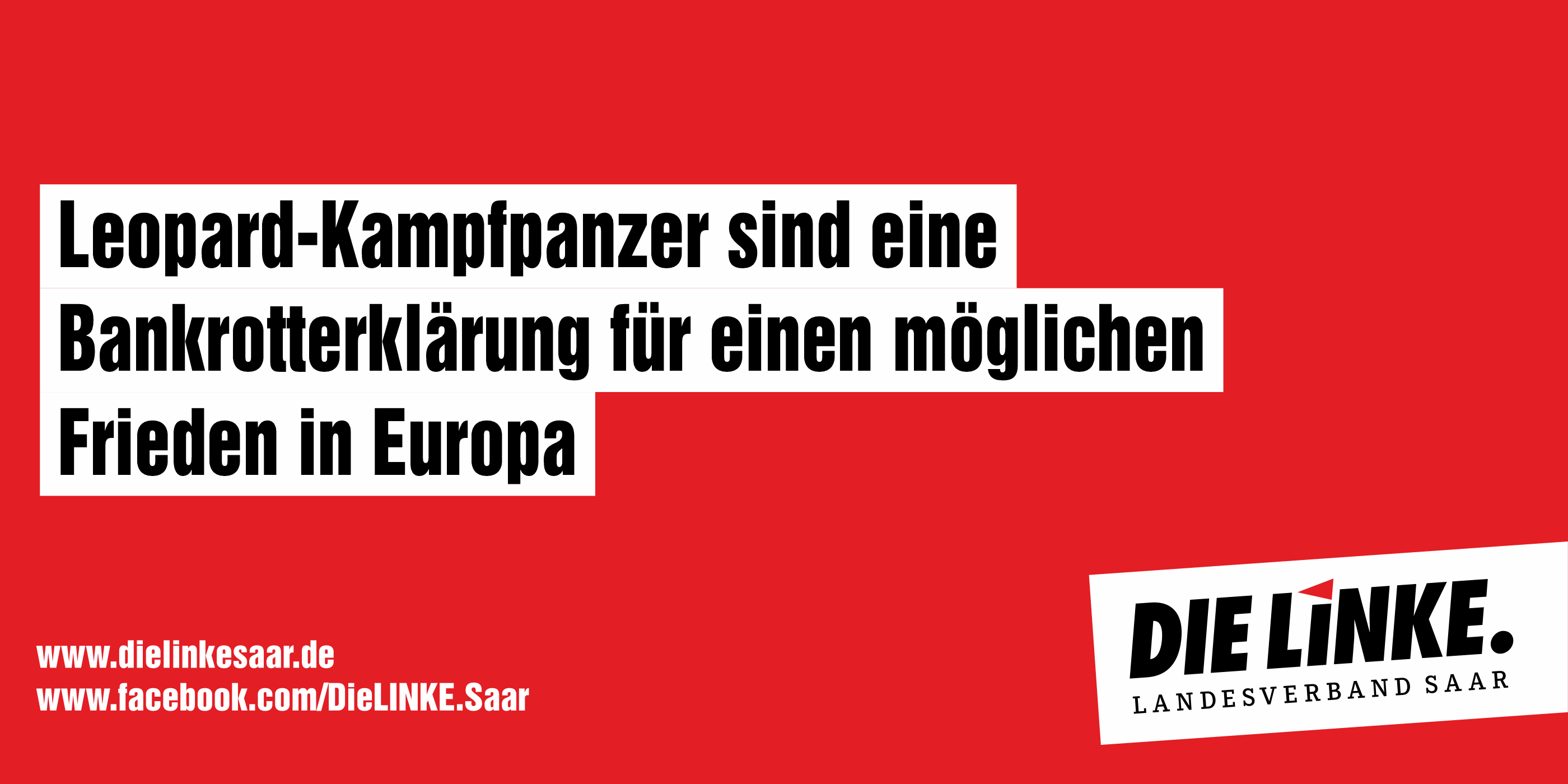 „Panzer statt Verhandlungen – so wird dieser sinnlose Krieg immer weiter eskalieren. Statt immer mehr und nun auch schwerere Waffen braucht es dringend eine echte Friedensinitiative,“ erklärt die Landesvorsitzende der LINKE Saar, Barbara Spaniol. „Die Mehrheit der Bevölkerung ist gegen die Lieferung schwerer Kampfpanzer in die Ukraine. Trotzdem wird gegen diesen erklärten Willen weiter eine verheerende Politik gemacht - die Tabubrüche von Kanzler Scholz gehen weiter.“ Jede rote Linie der mil... » weiterlesen